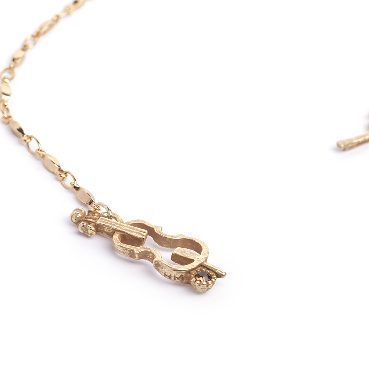 When worn with the bow charm threaded through the cello-shaped piece, the design playfully resembles a cello being played?making it a charming and unique accessory.