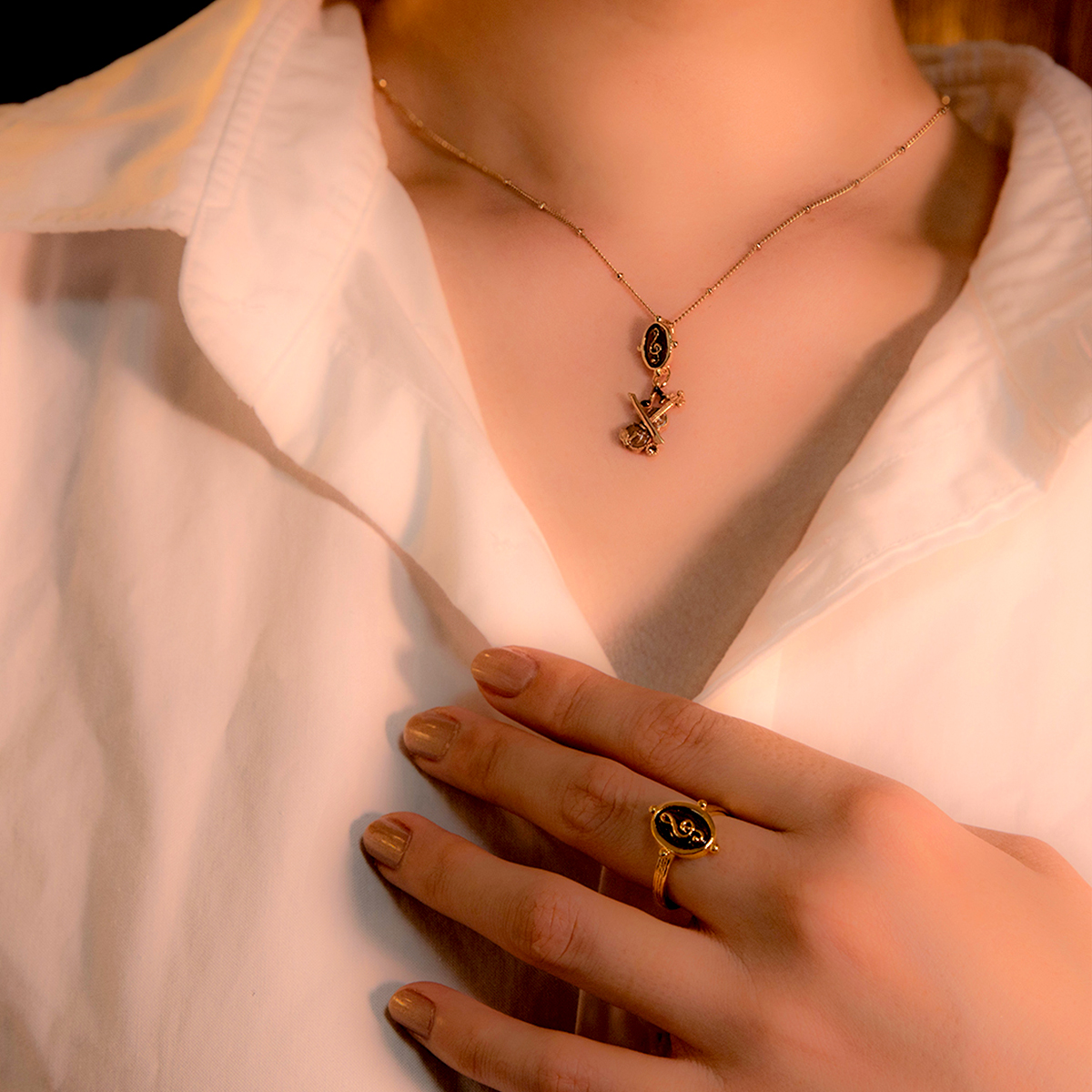 The background color recalls the deep brown ink once used in old music scores, designed to create a striking contrast with the paired “Bass Clef Ring.”
