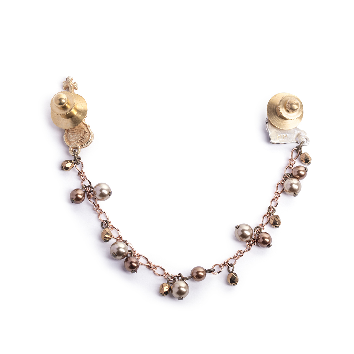The chain connecting the two motifs is adorned with brown-toned beads arranged randomly, adding exquisite and elegant sparkles.