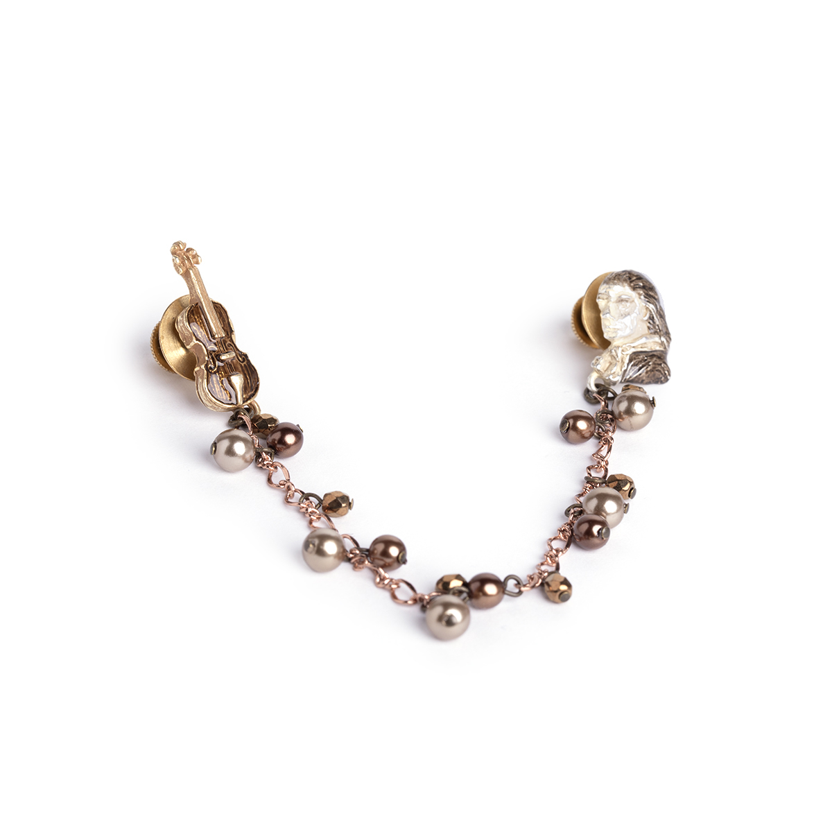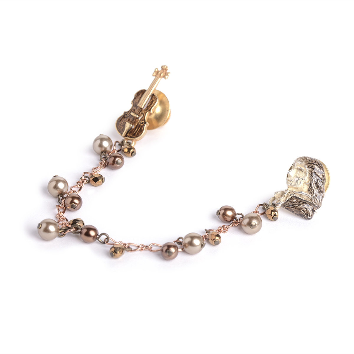 The pin features Stradivari’s dignified profile gazing toward a violin he crafted, colored in a rich brown that evokes the depth of history and imparts a sophisticated impression.