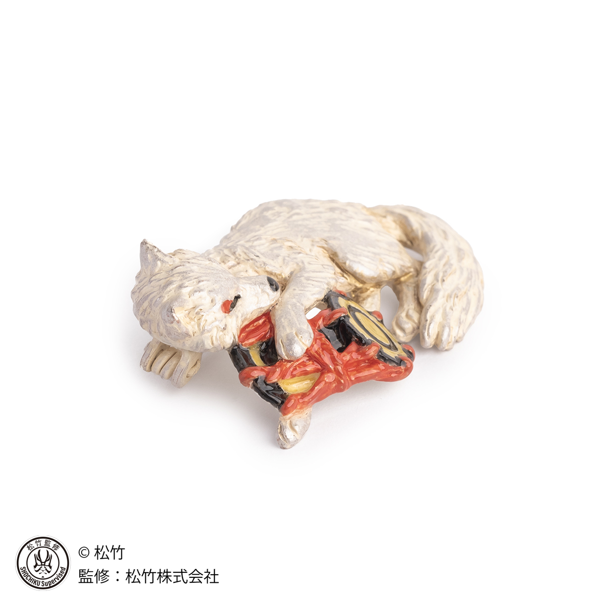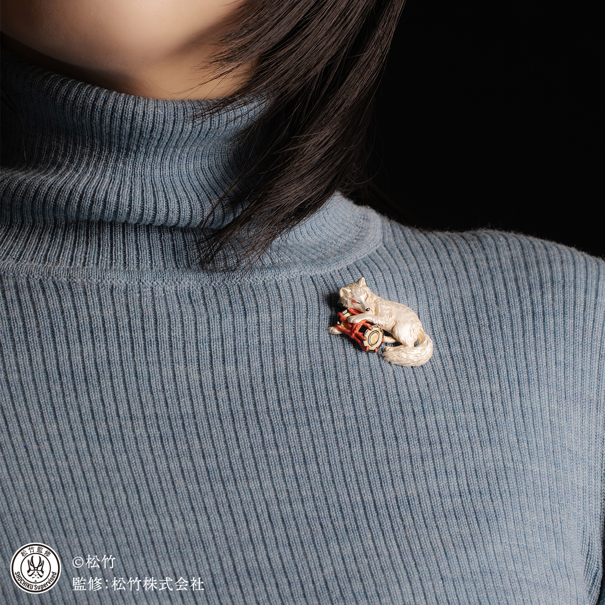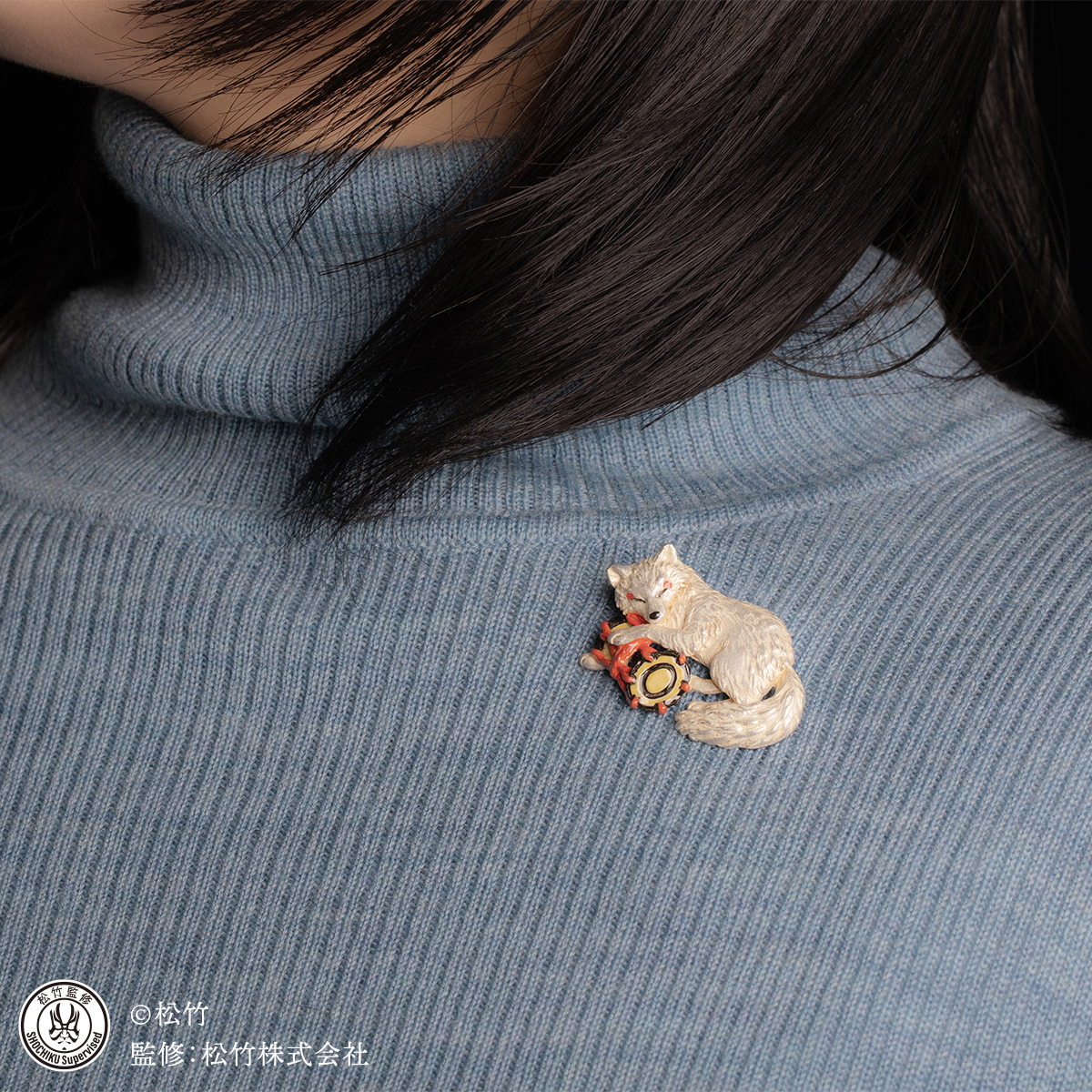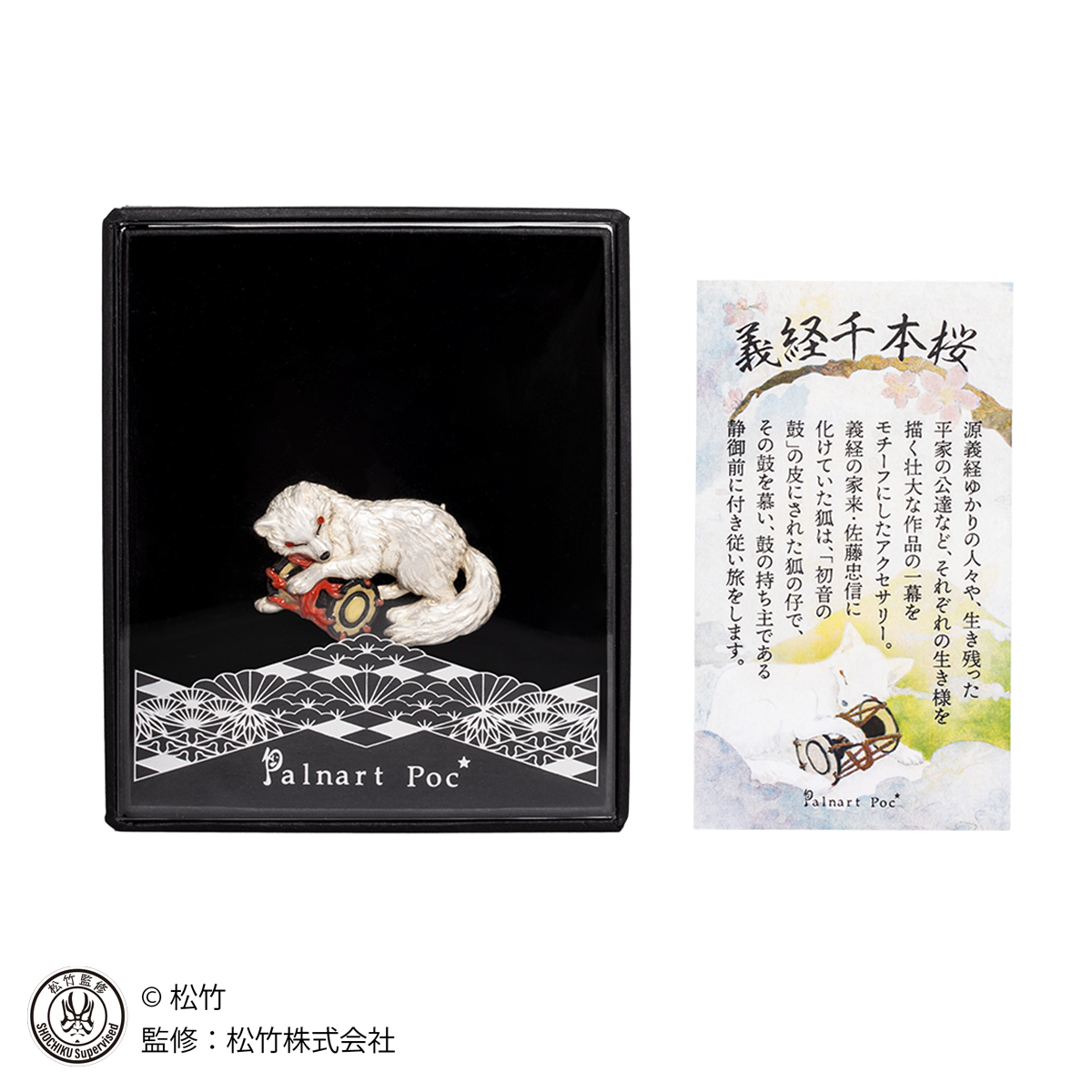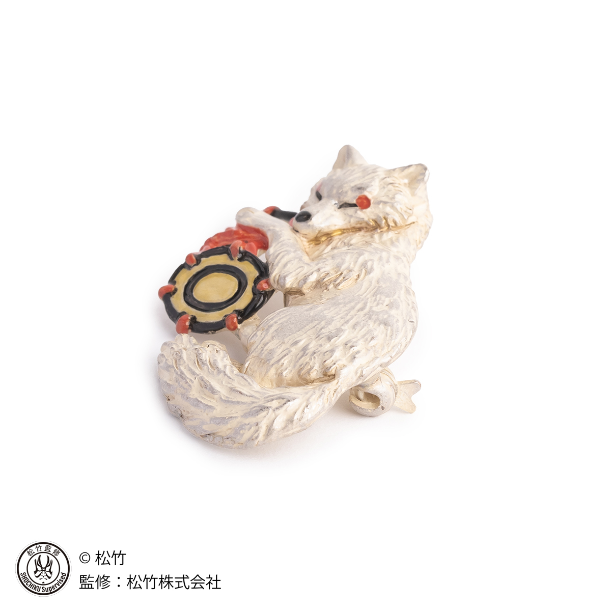 このブローチは、作中に登場する「初音の鼓」と、義経の家来・佐藤忠信に化けていた狐をモチーフにしたアイテム。