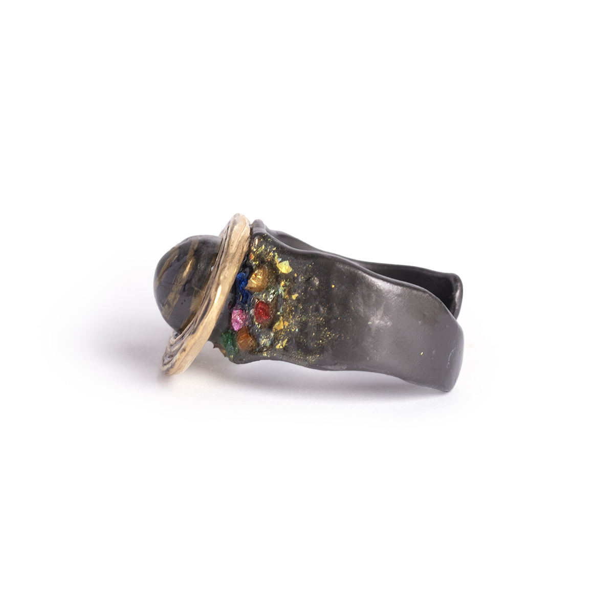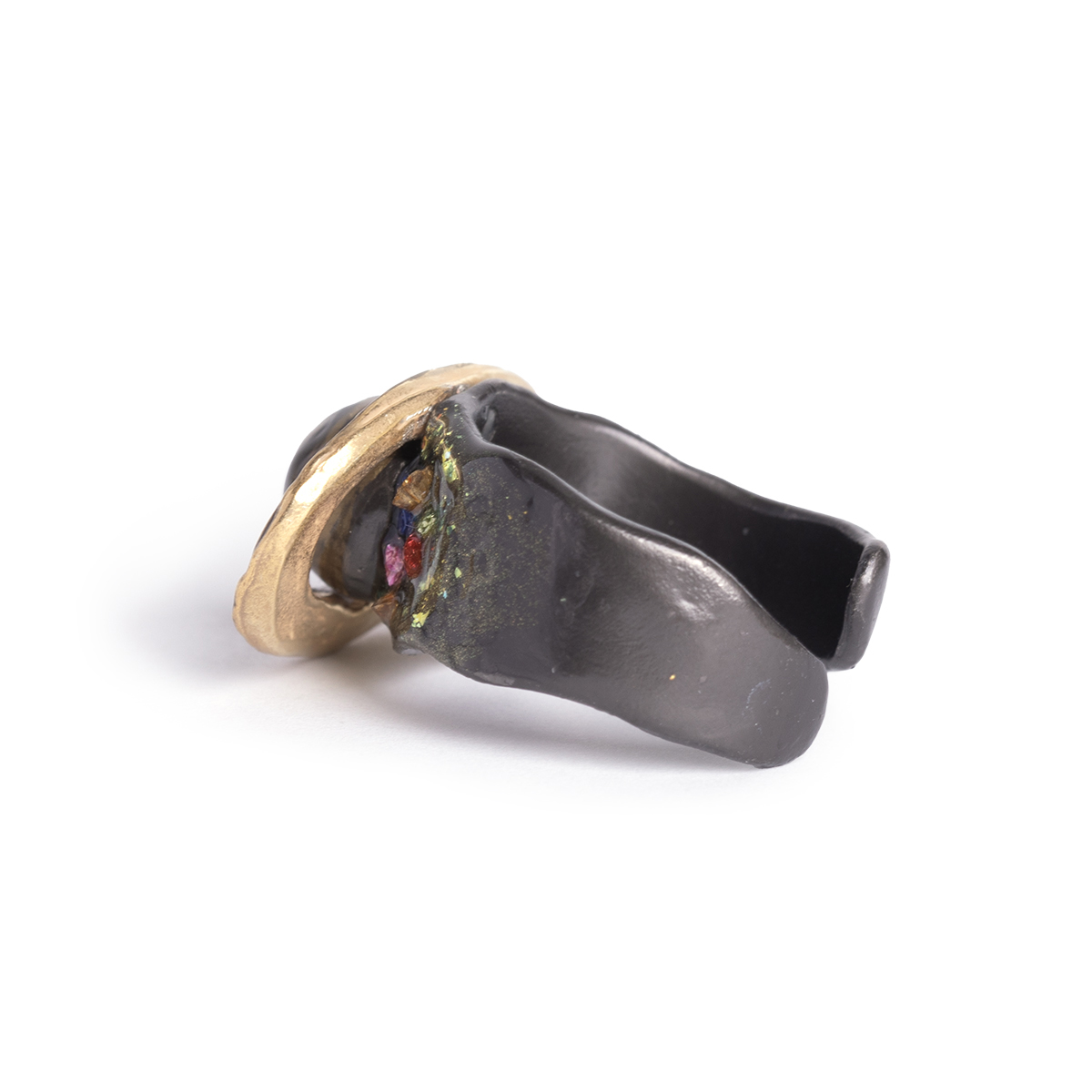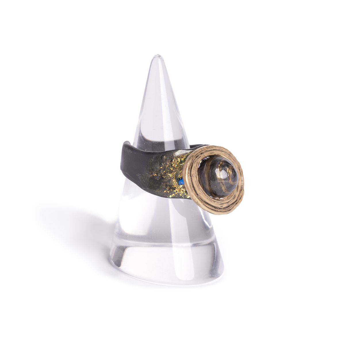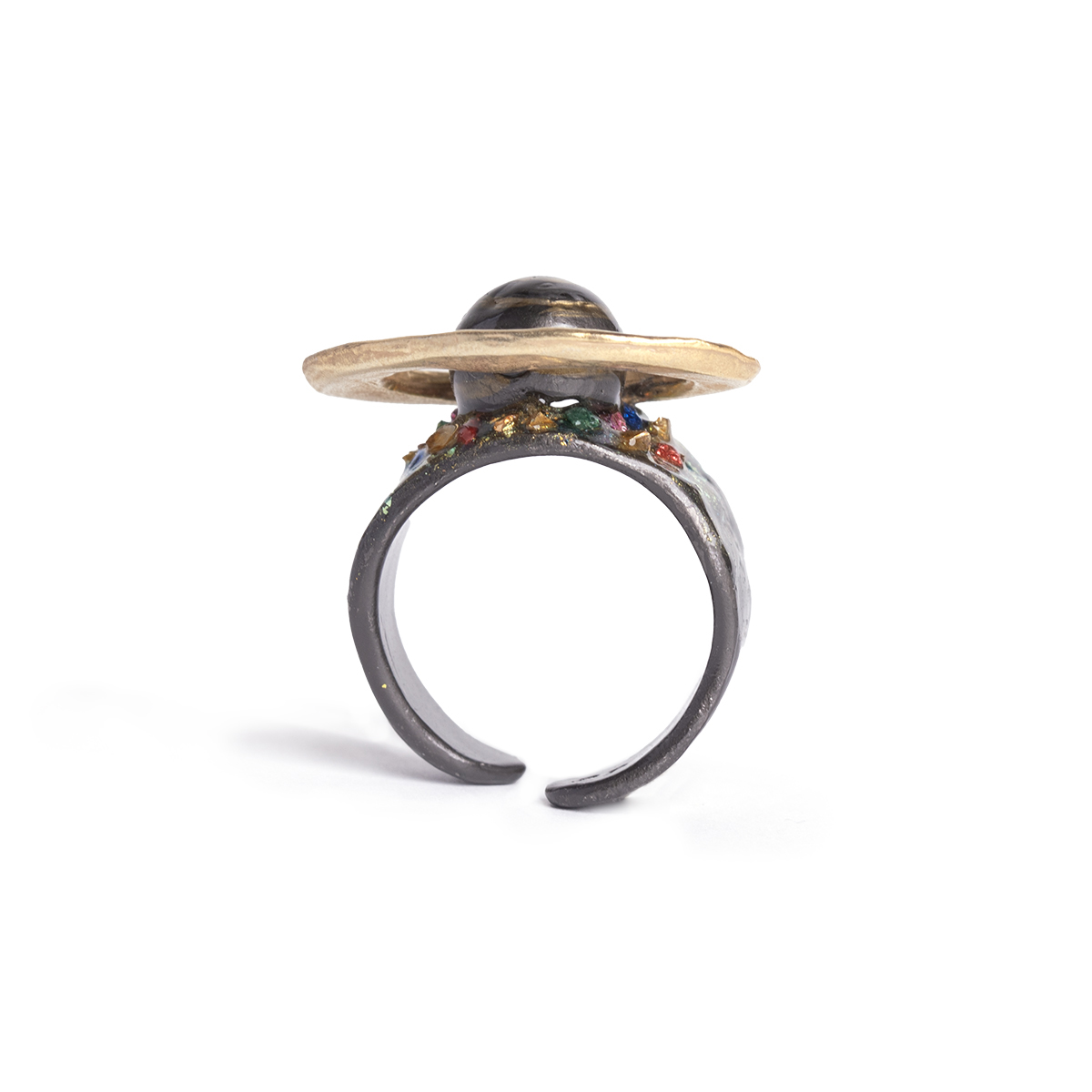 リングの腕部分には、ゴールドのラメや星々の光を映したようなカラフルなガラスパーツを散りばめ、土星の環に浮かぶ氷を表現しています。
