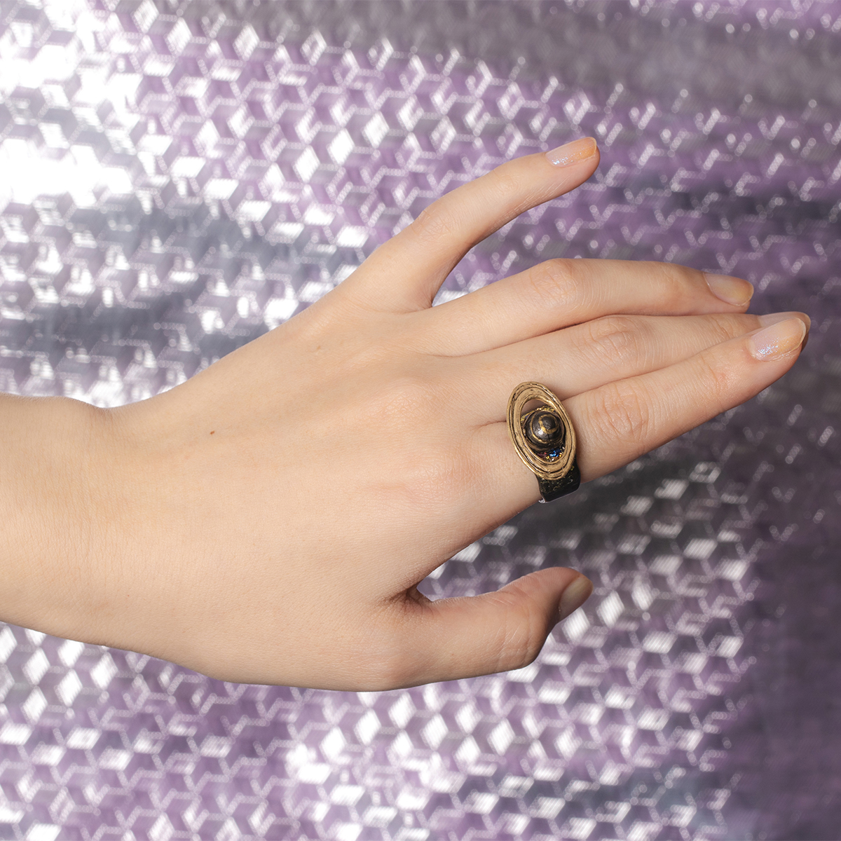土星の環をわずかに傾けることで、着用時に美しく見えるデザインに仕上げました。