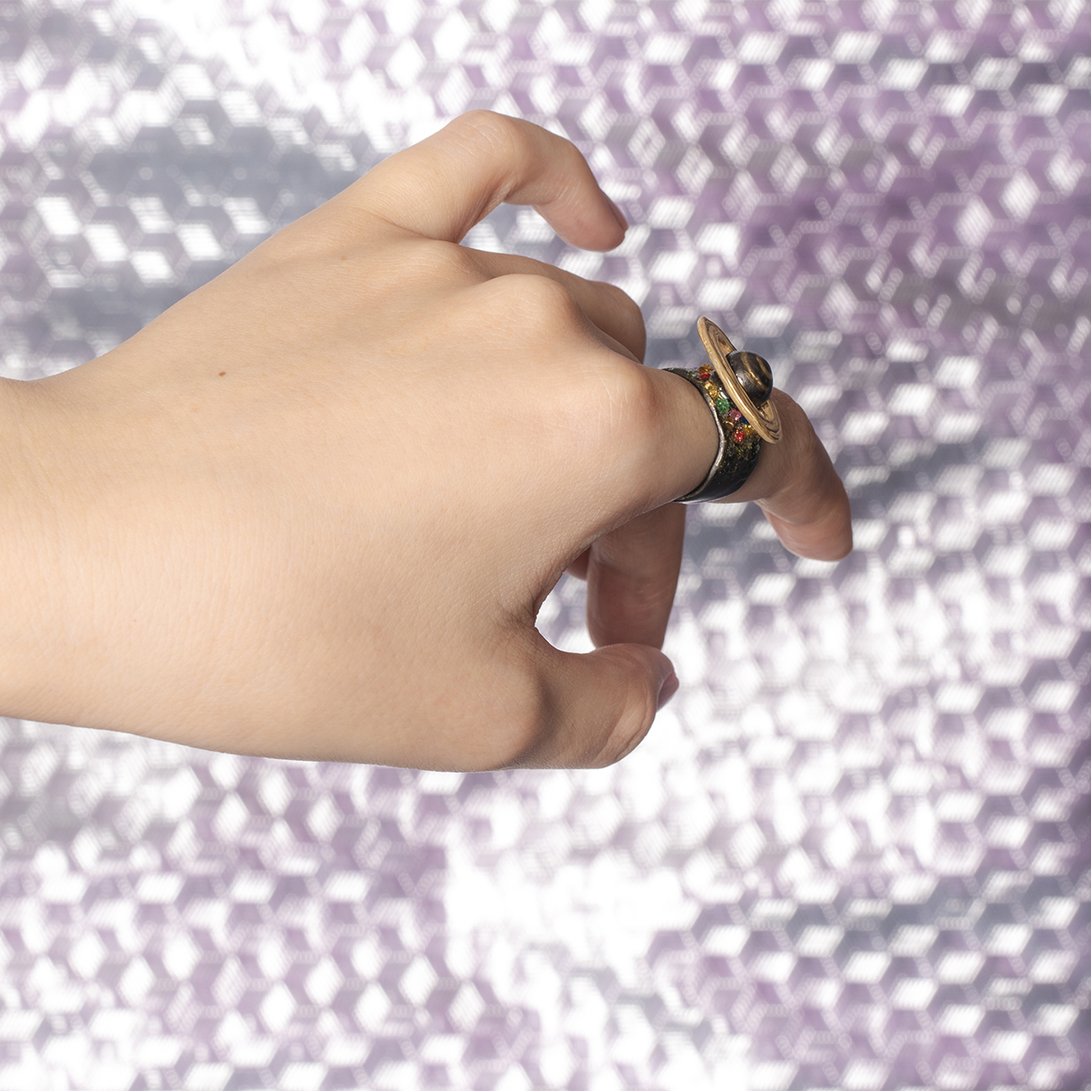 立体的に表現された土星と、土星を囲う環をモチーフにしたリング。