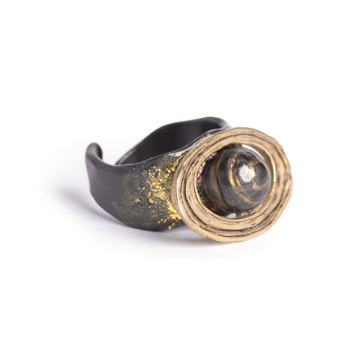 A ring featuring a three-dimensional Saturn and its shimmering golden rings.