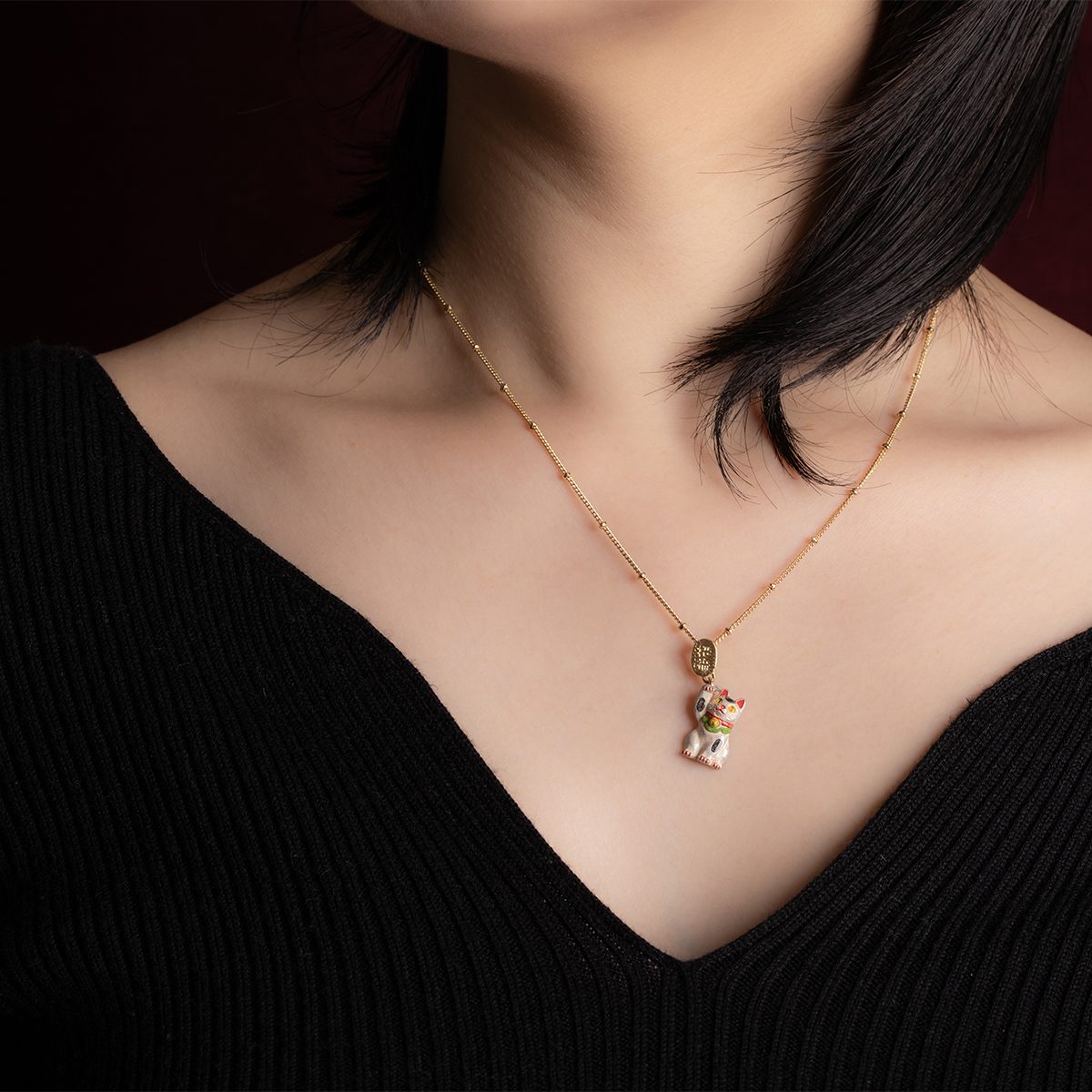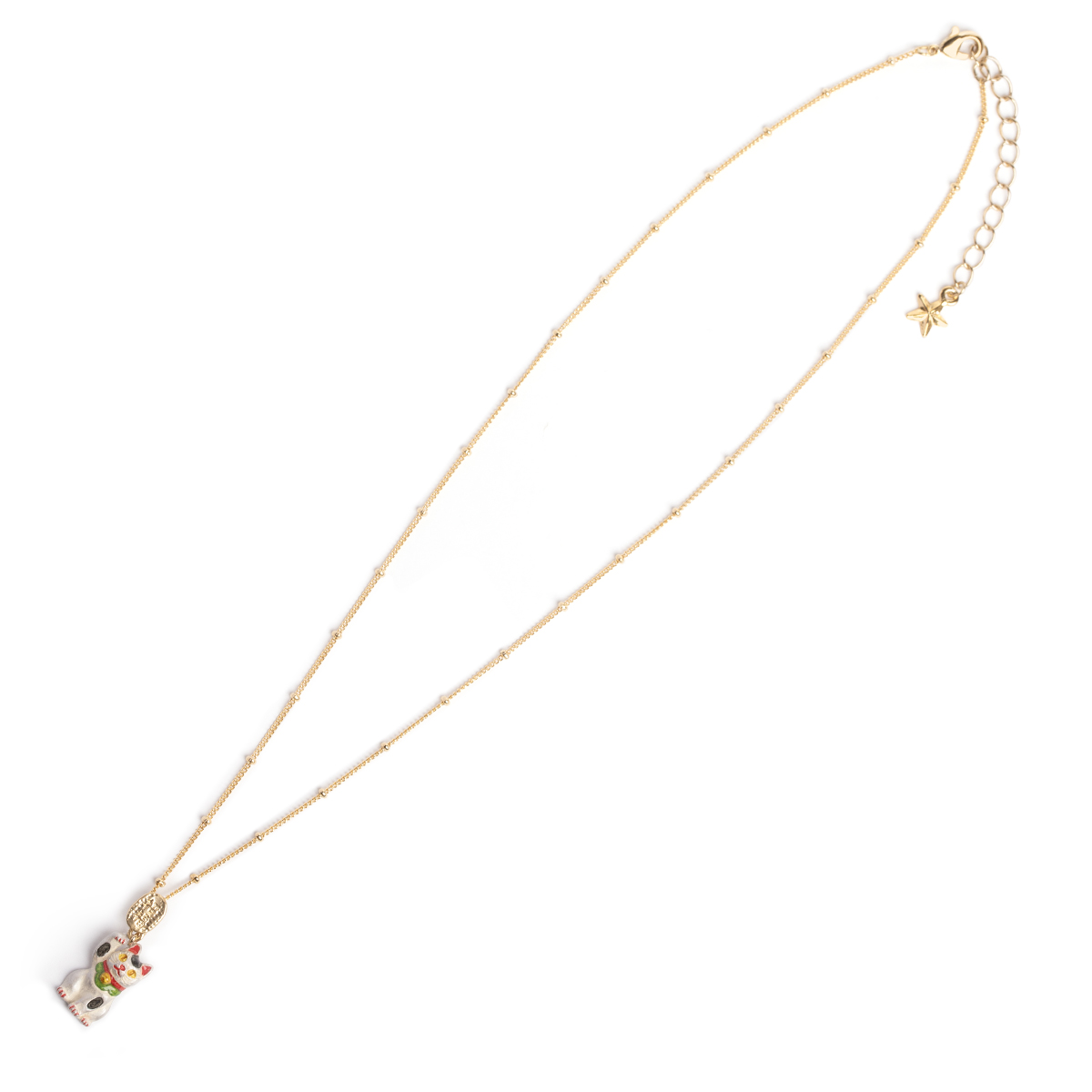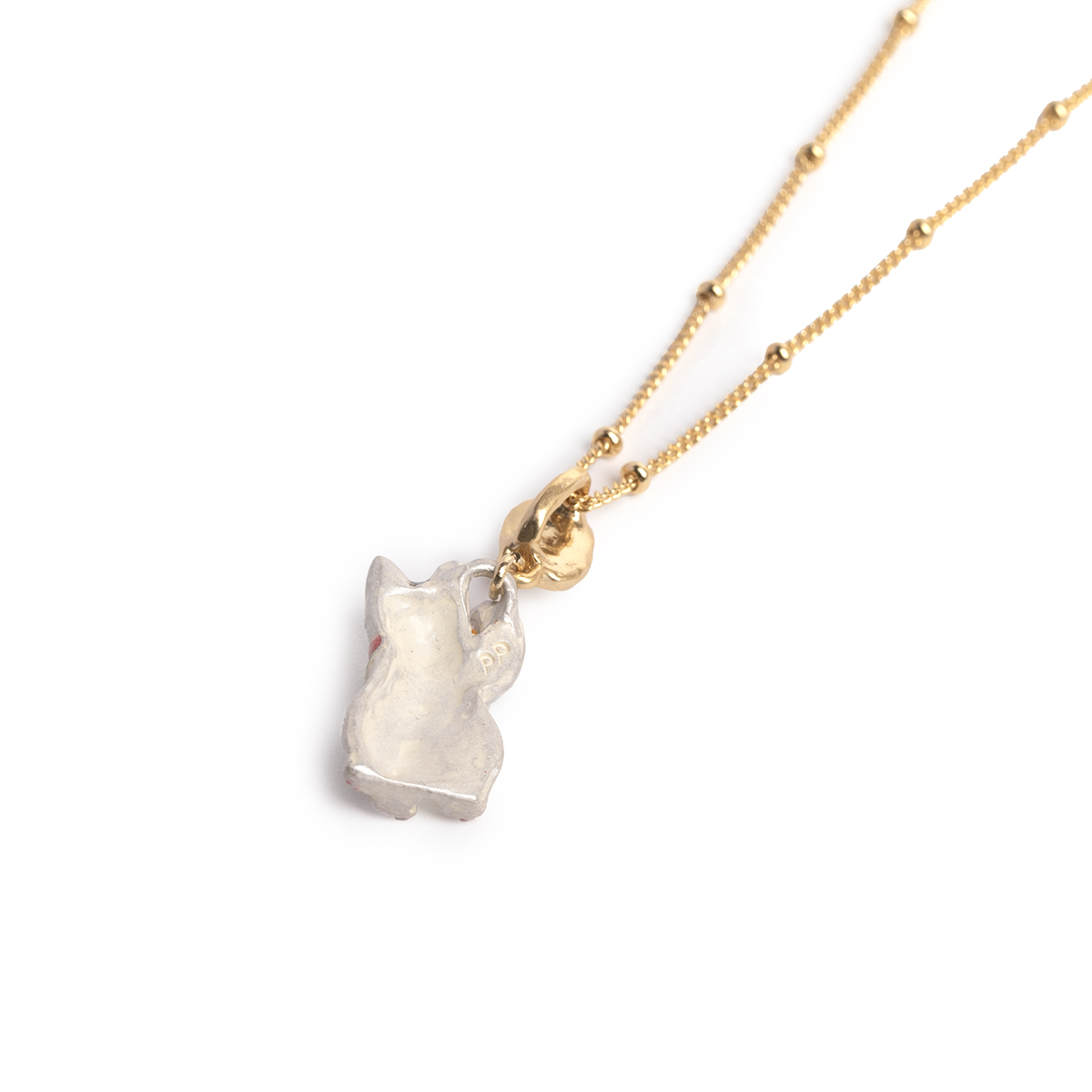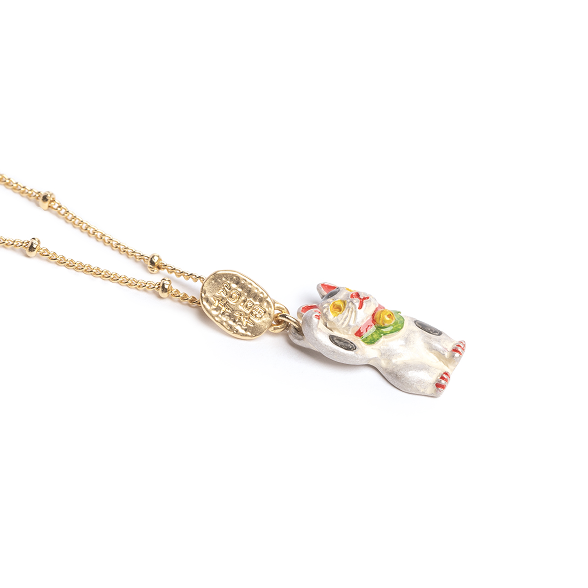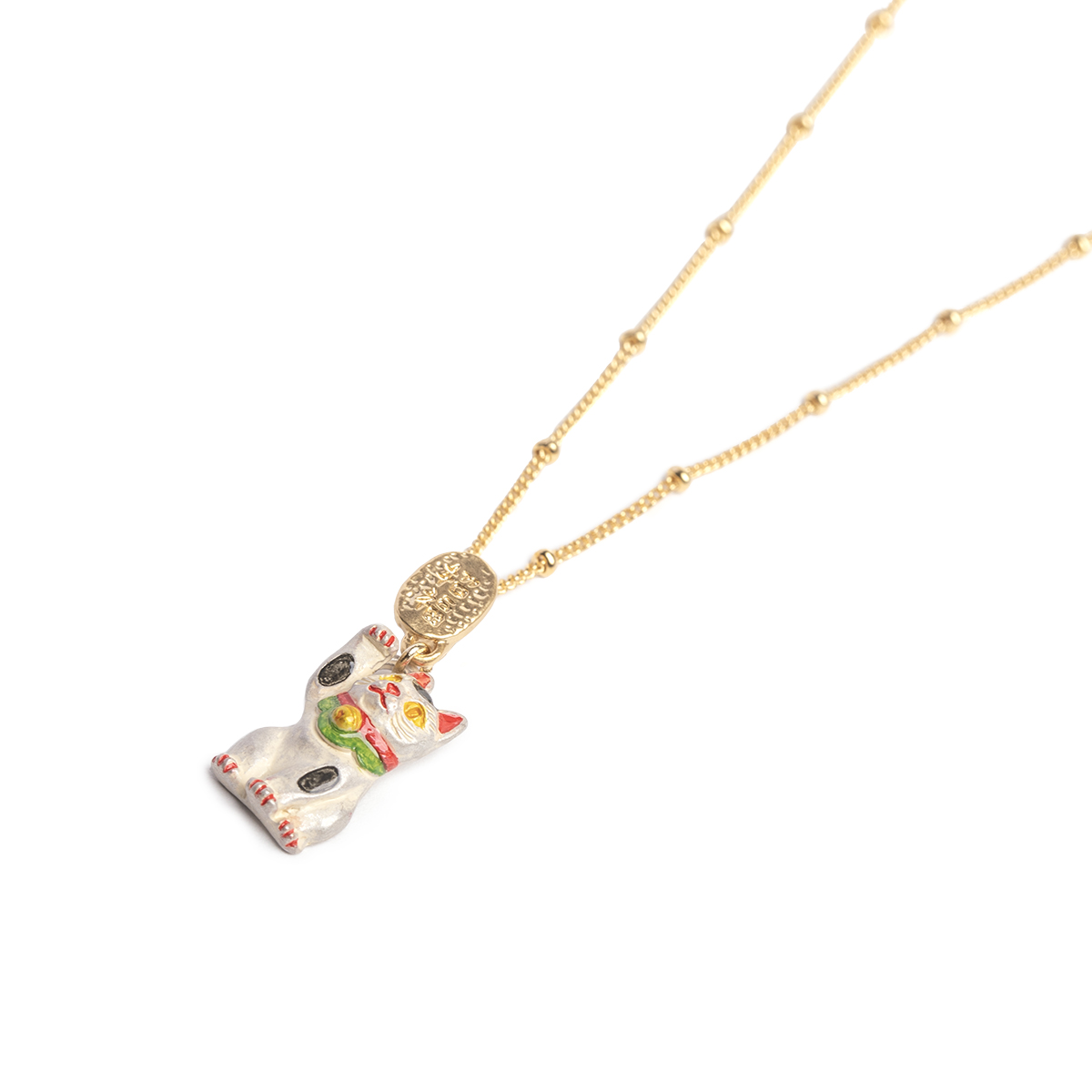 A necklace featuring a white lucky cat (maneki-neko).