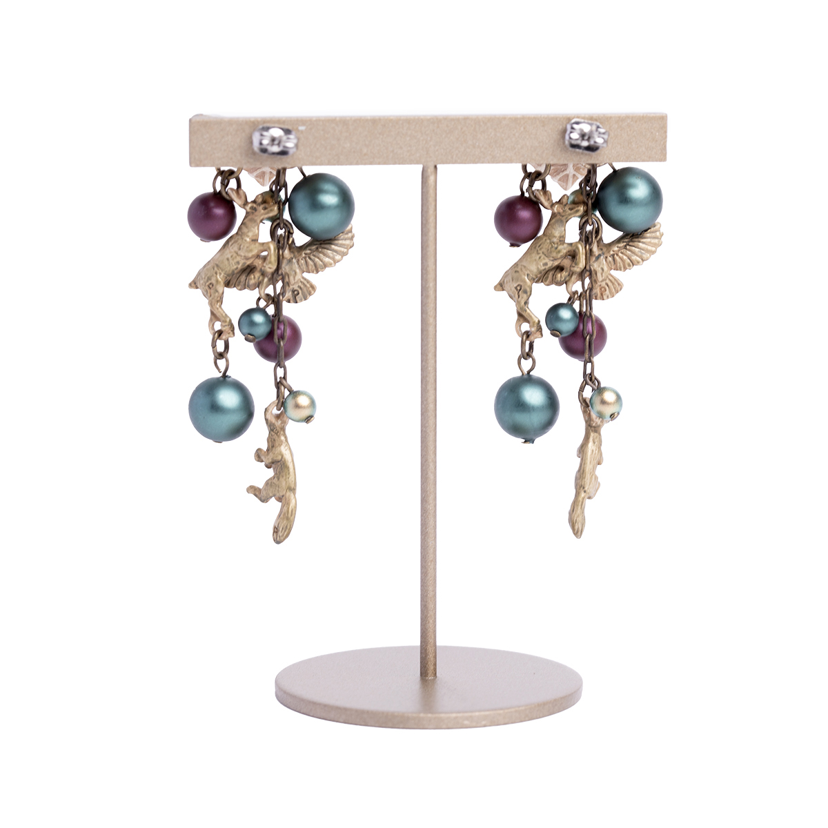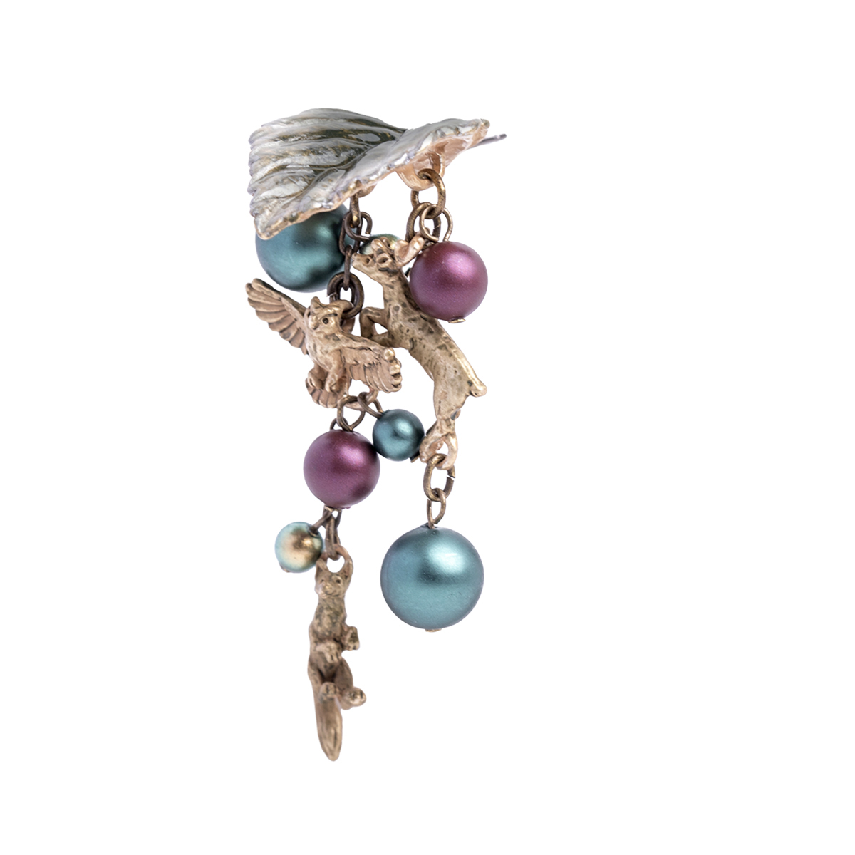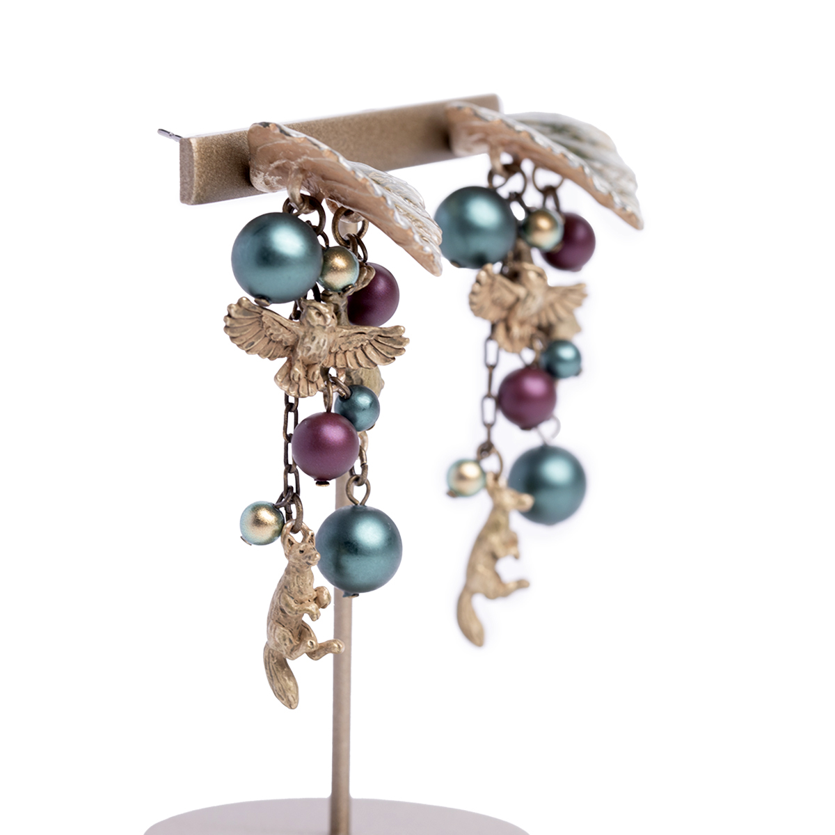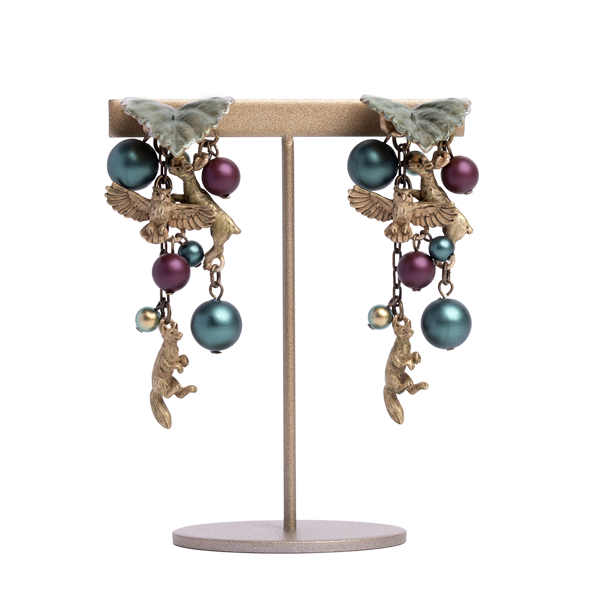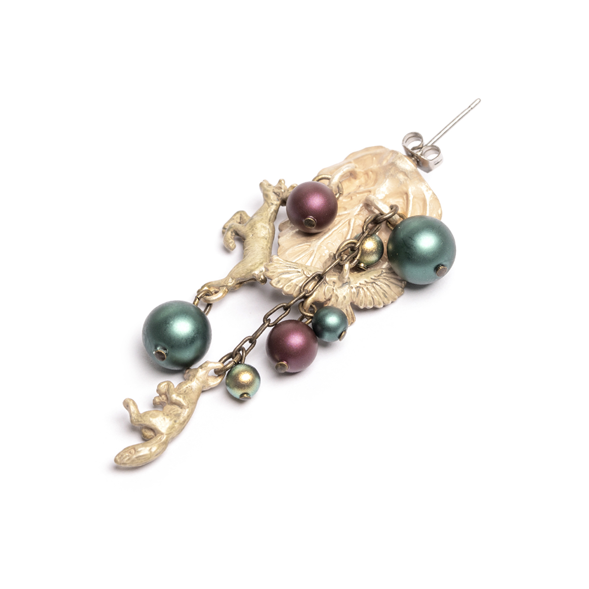森の中でダンスを楽しむ動物たちを、こっそりのぞいているようなデザインのピアス。