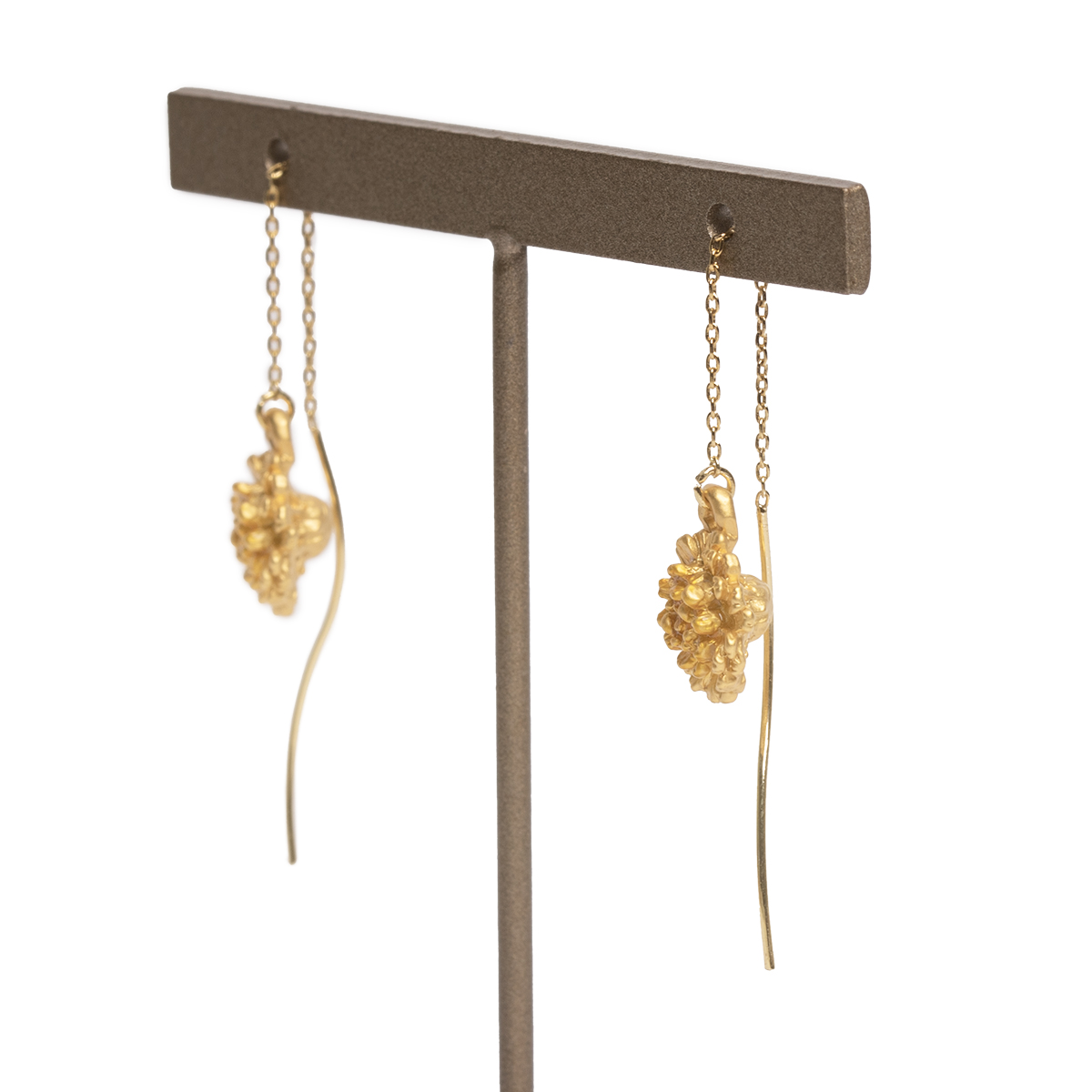 華奢なデザインながら、垂れ下がるチェーンがアクセントとなり、シンプルな装いでも耳元に印象的な表情を添えます。