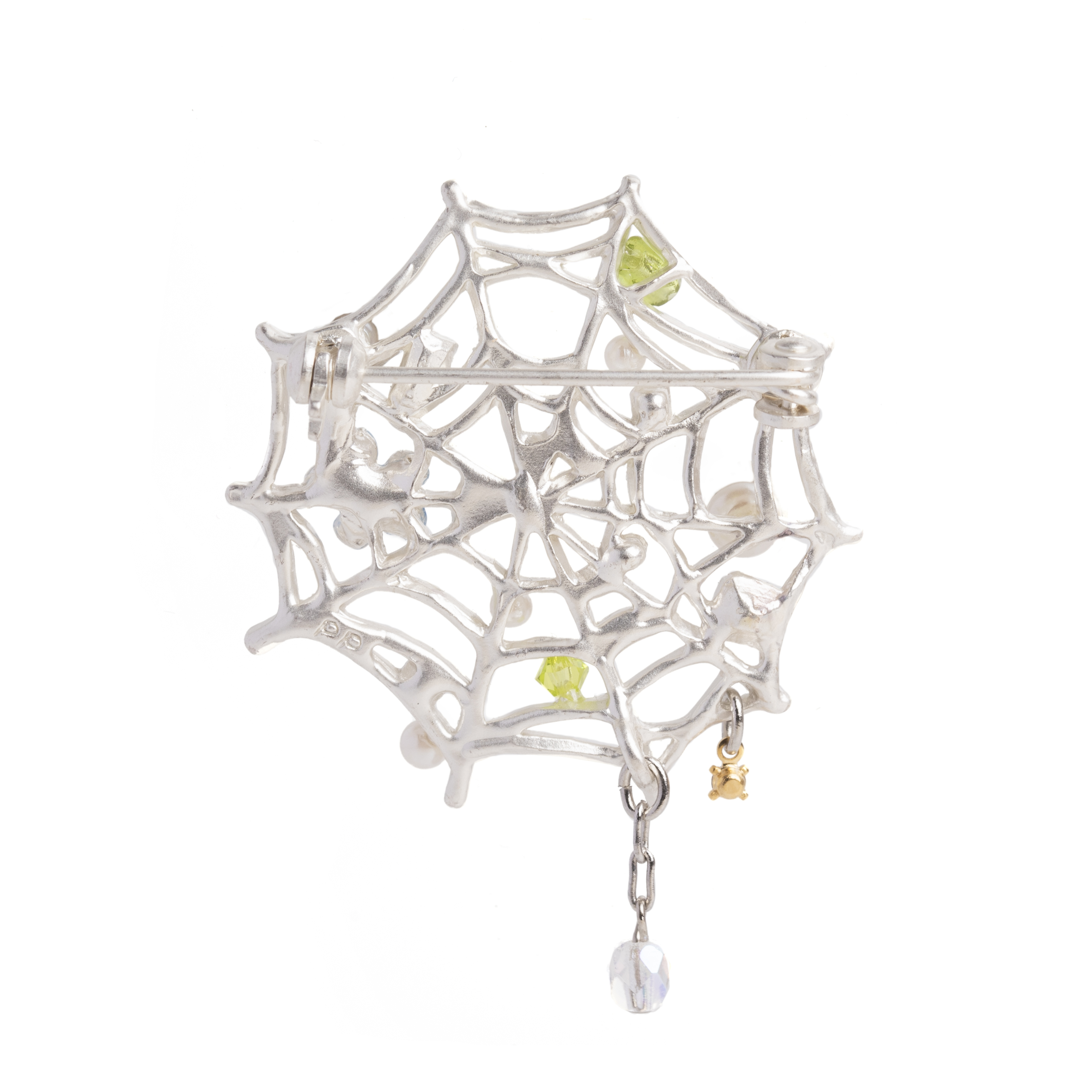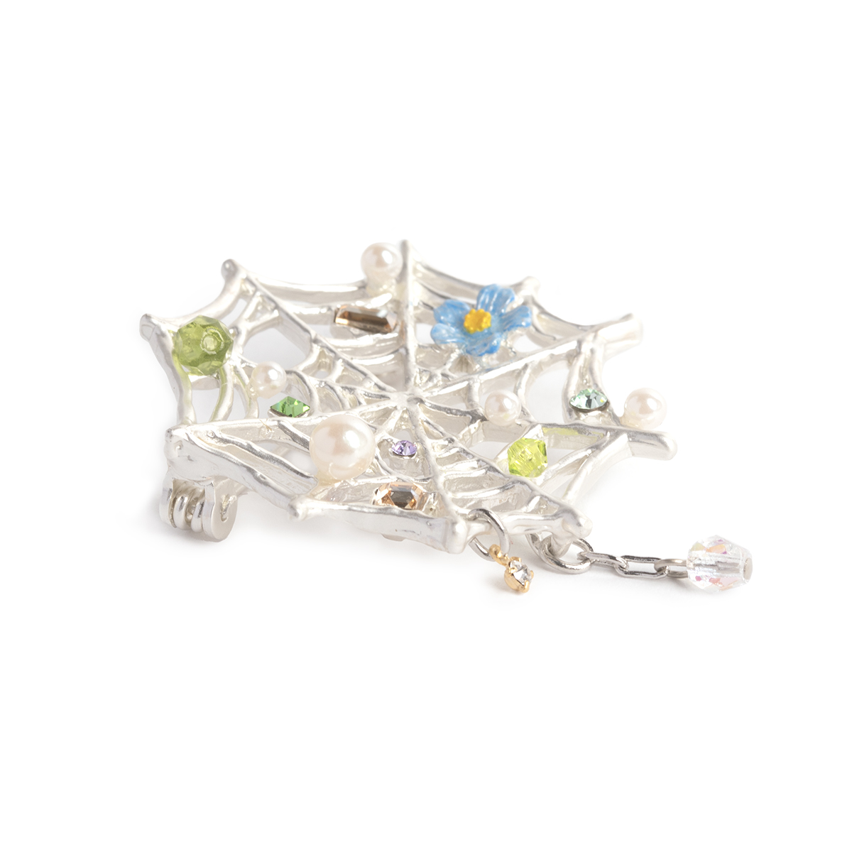 華やかに飾り付けられた、くもの巣をモチーフにしたブローチ。
