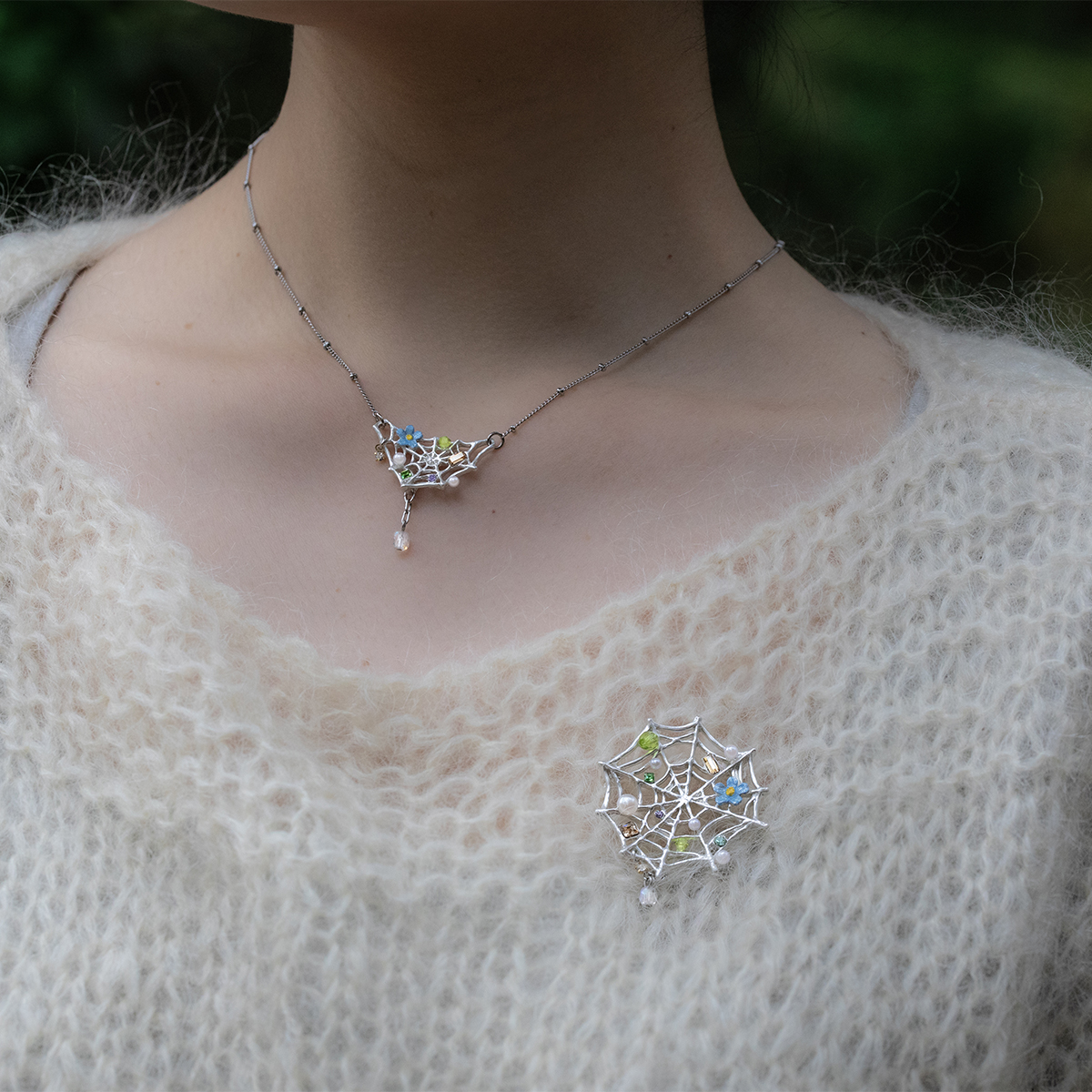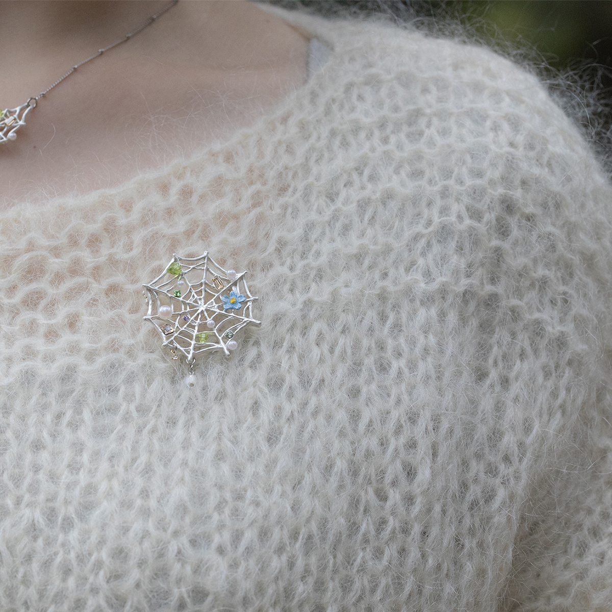 This brooch is inspired by a spider web, adorned with an elegant and decorative touch.