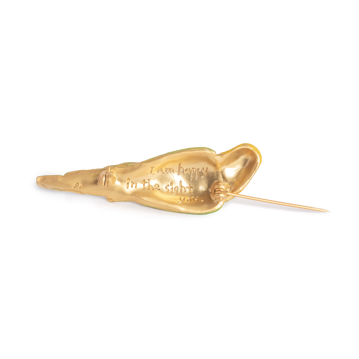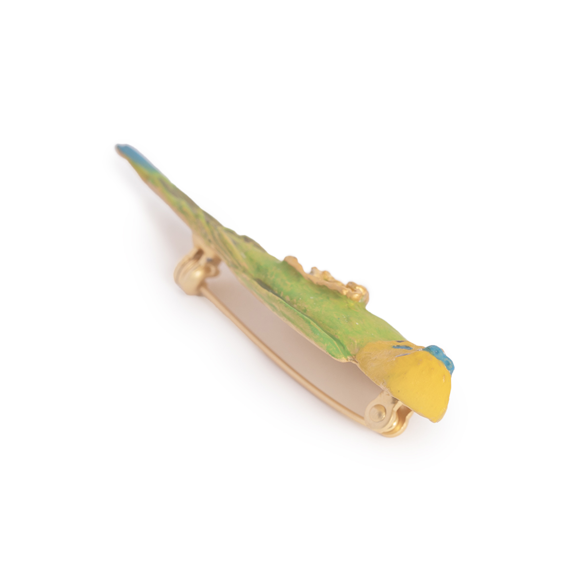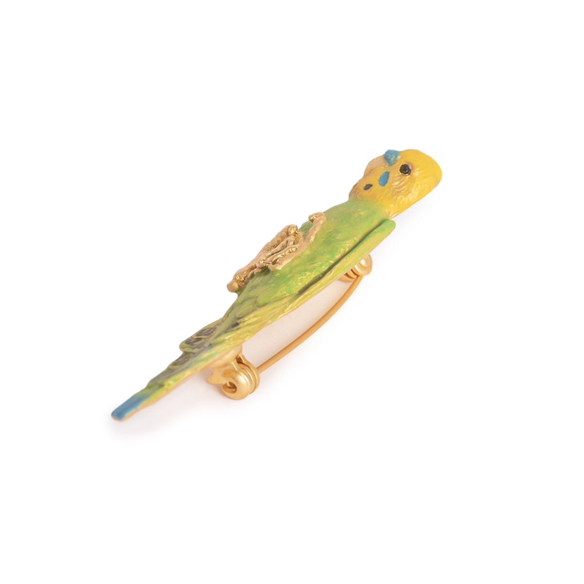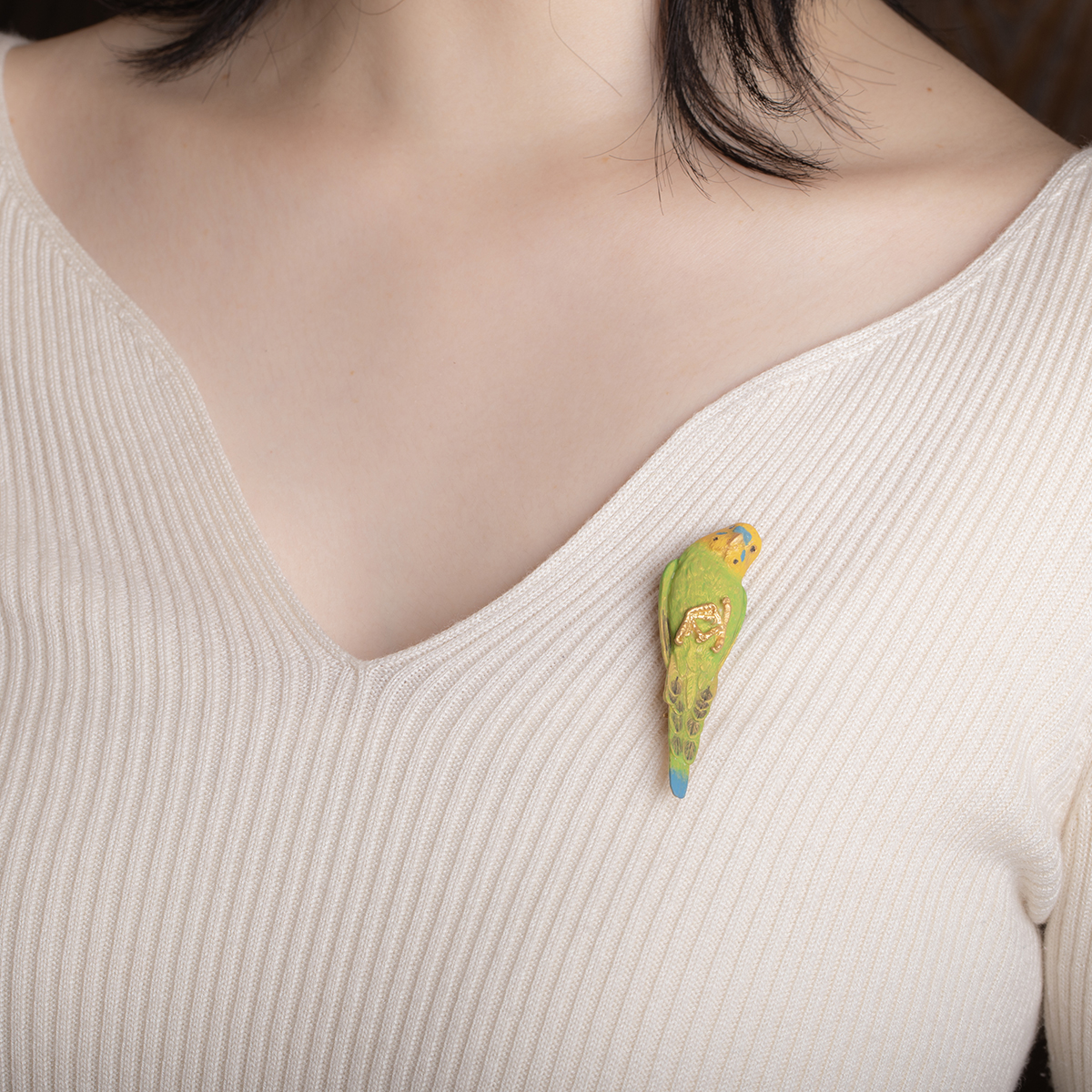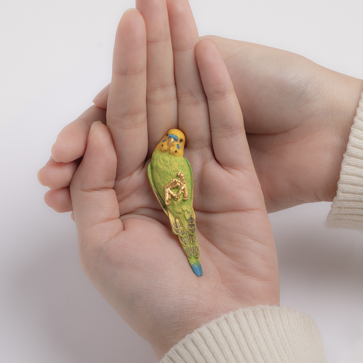 This brooch is inspired by a parakeet relaxing contentedly in the palm of your hand.