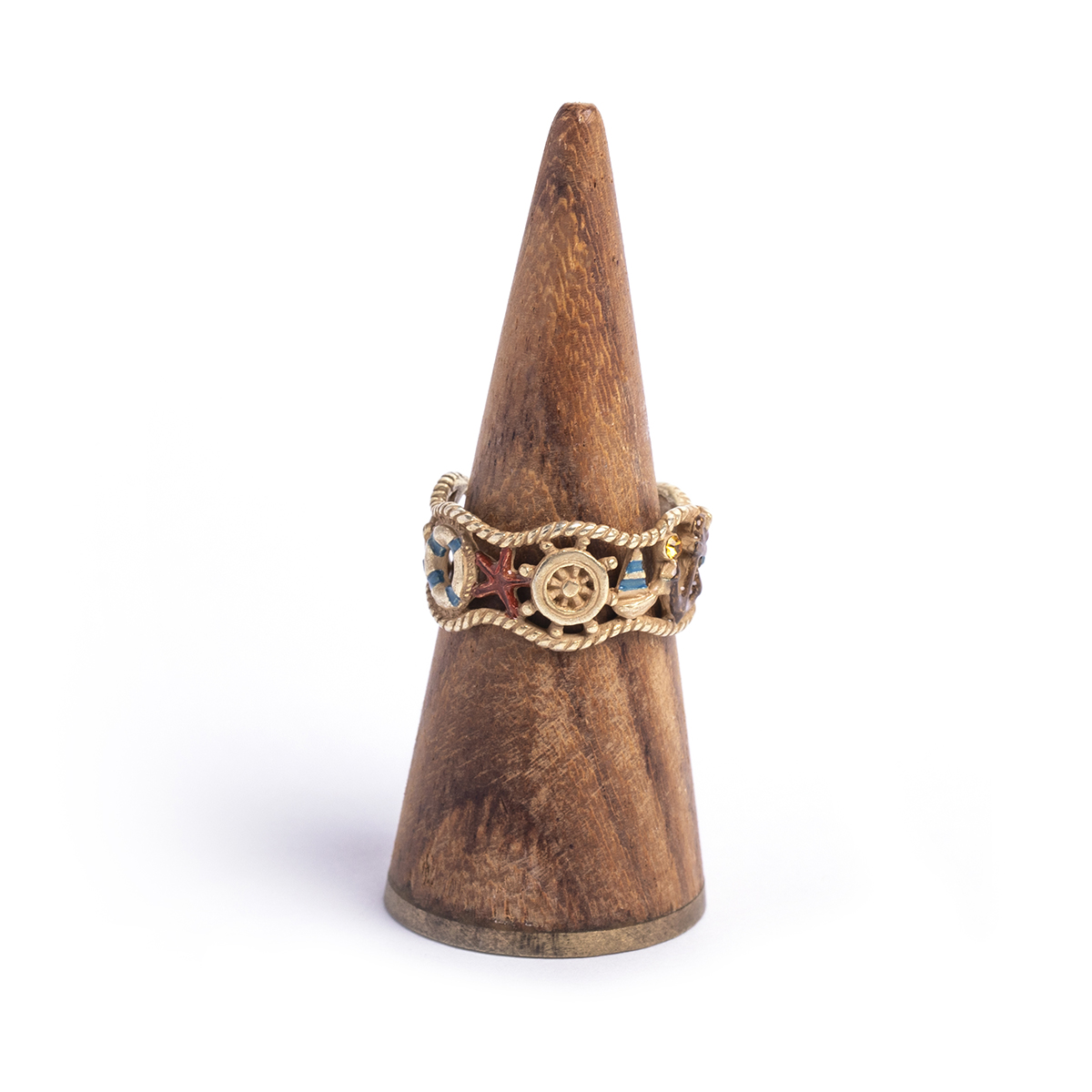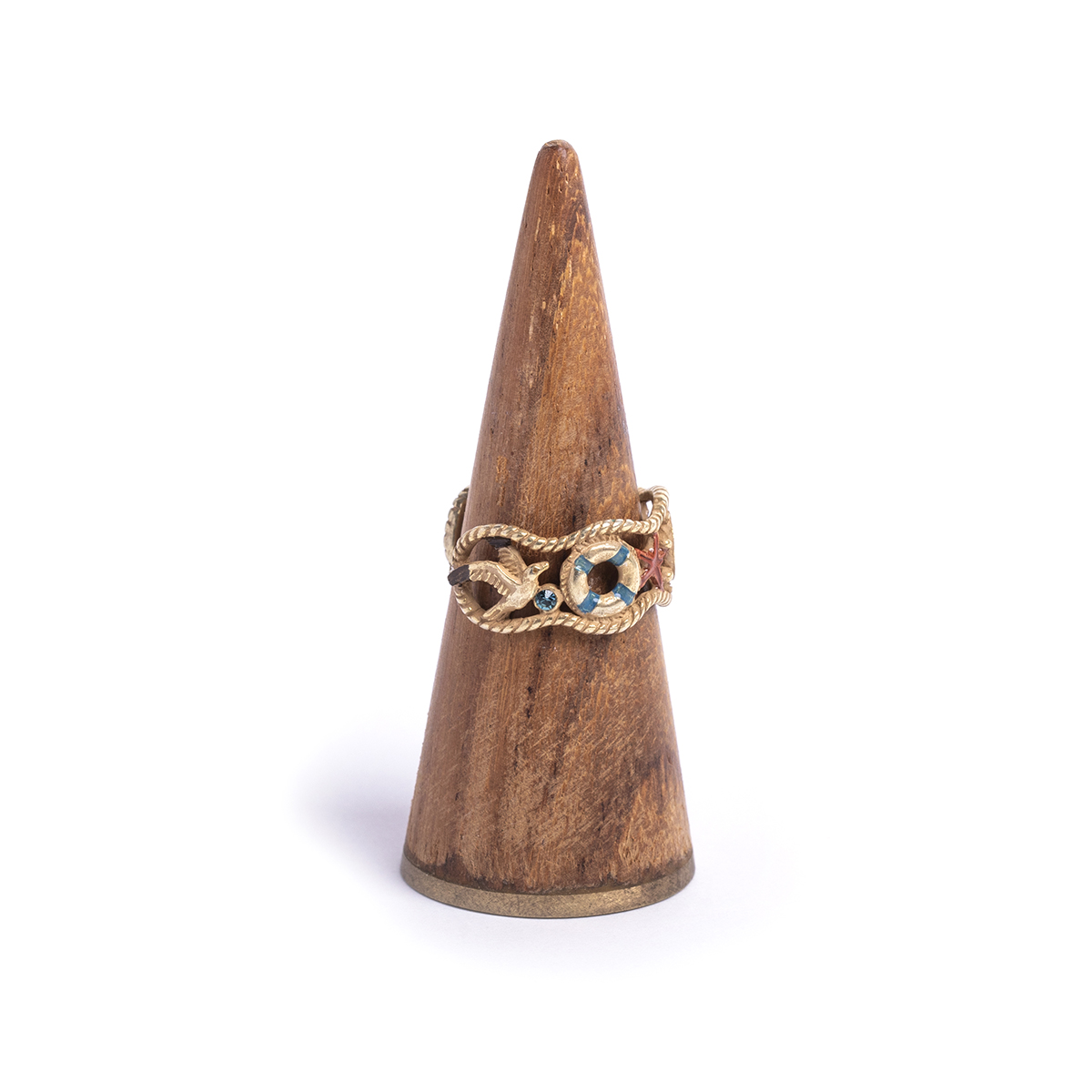 使い込まれた海図をイメージしアンティークな風合いを見せるくすんだ色と、少しずつ海の中へと潜りこんでいくよう配置されたモチーフが印象的。