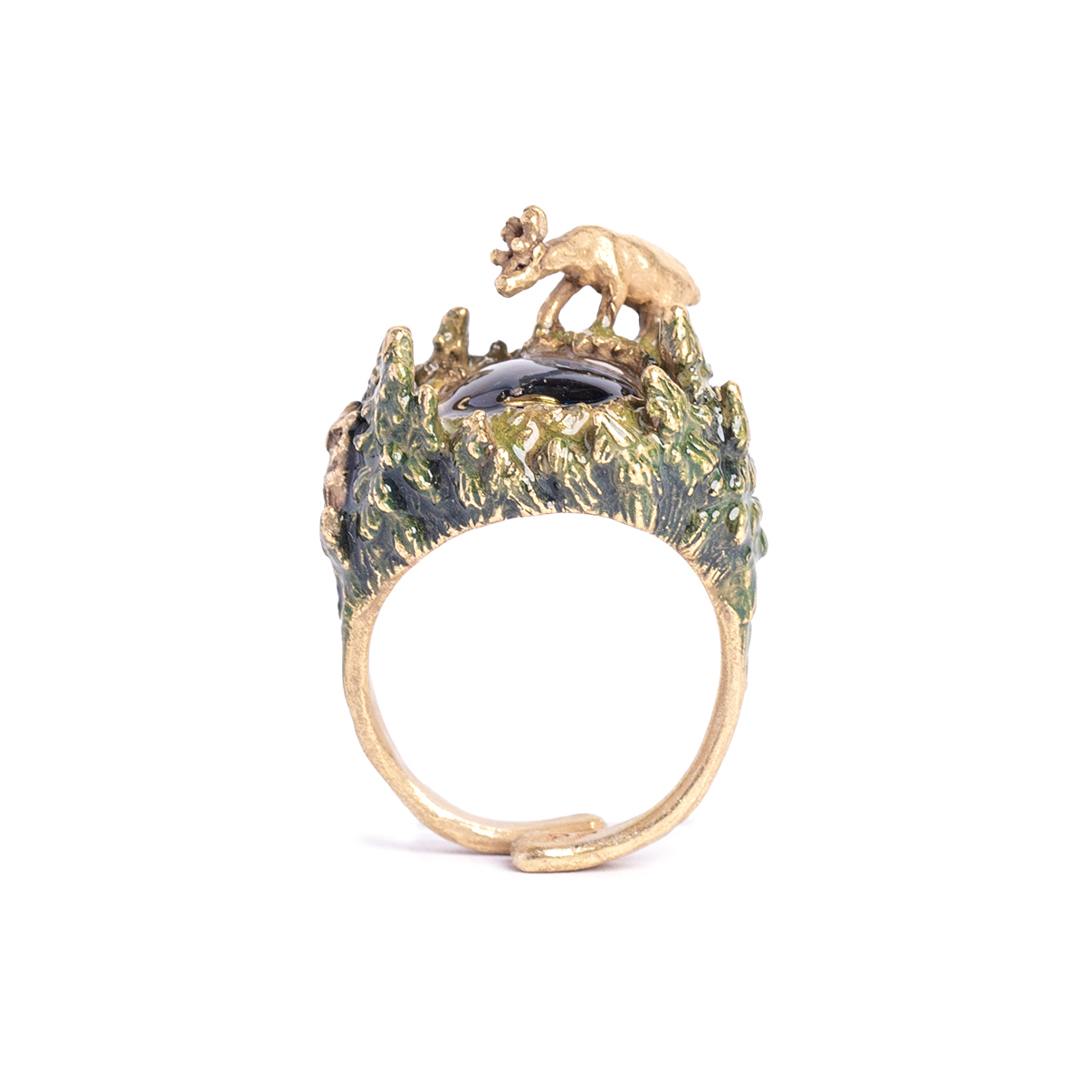 A ring portraying a deer visiting a spring under the night sky.