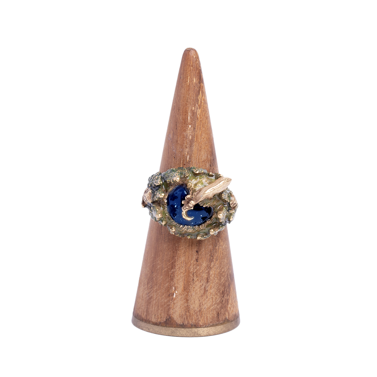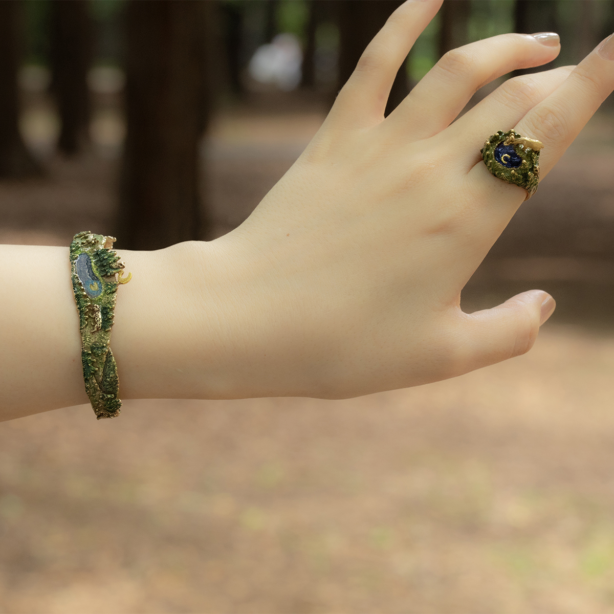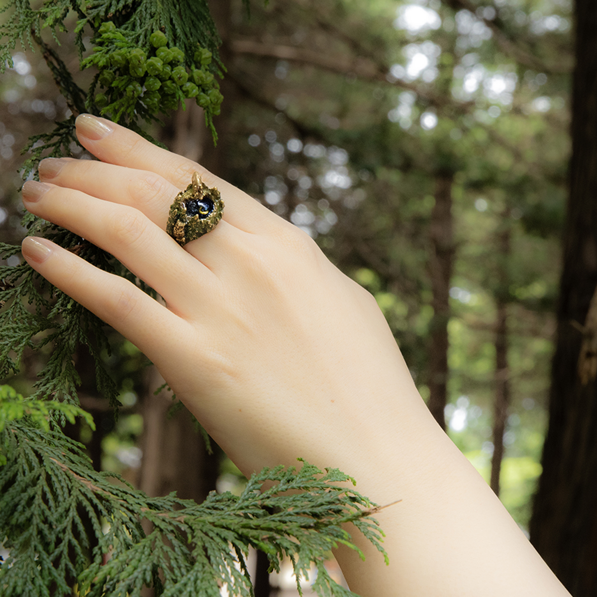 リングの側面になる部分にはヤマネコやミミズクが顔をのぞかせ、どの角度からも楽しめるデザインになりました。