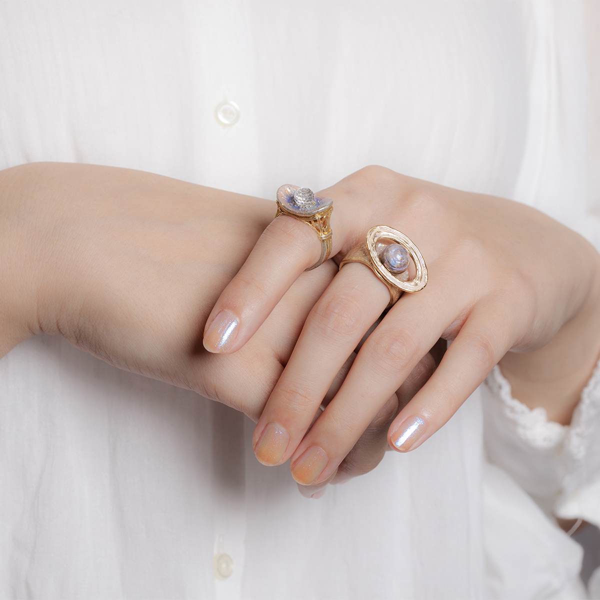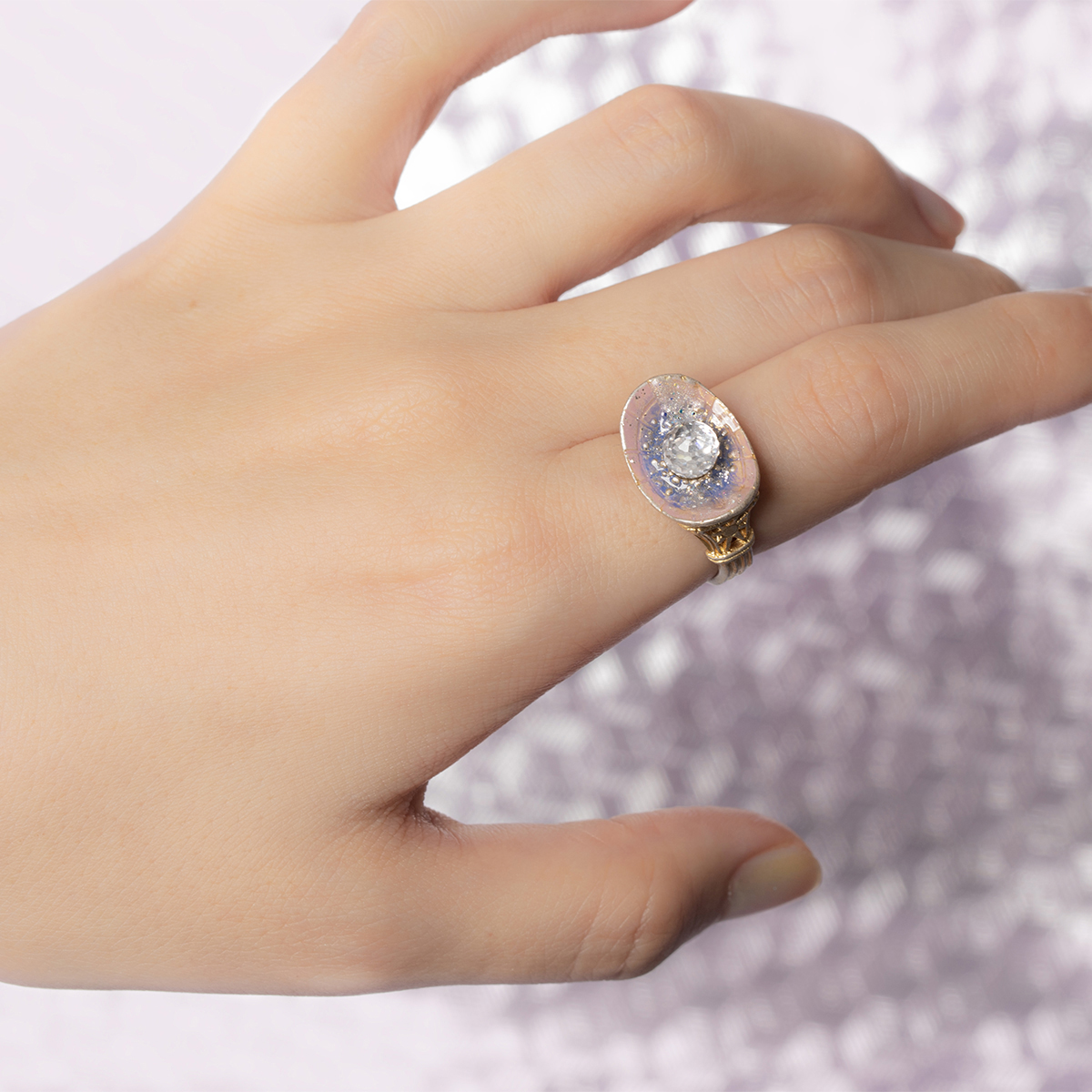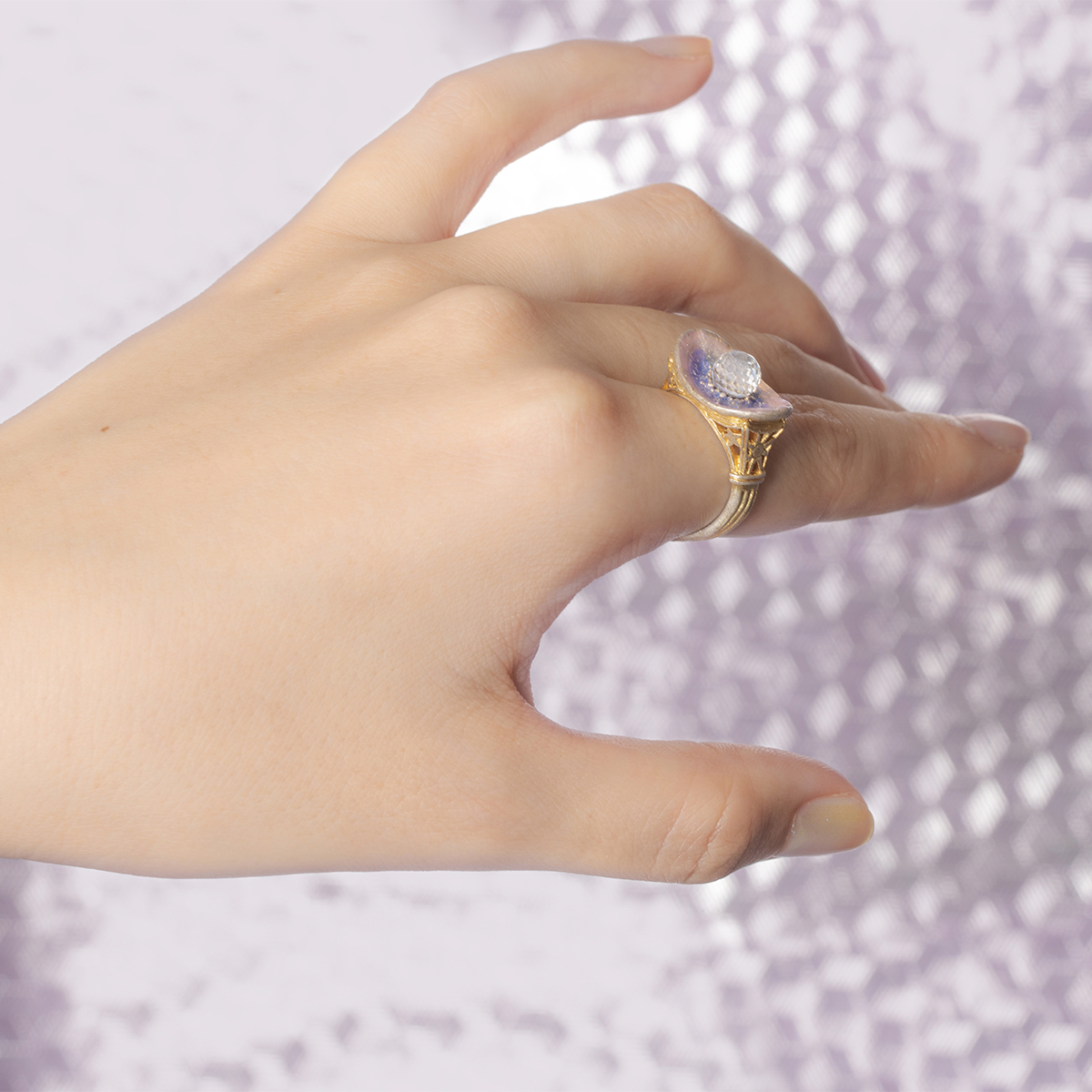 中央のカットガラスは星のきらめきをイメージし、指を動かす度に光を反射して、まるで夜空に瞬く星のよう。