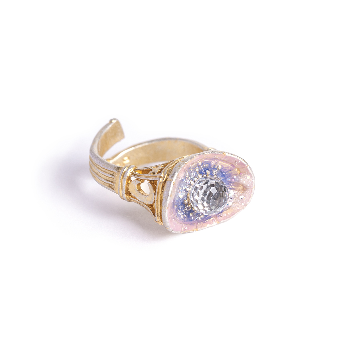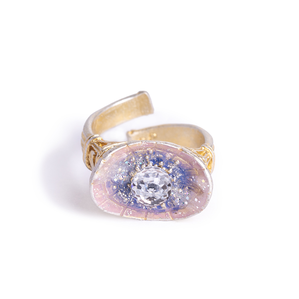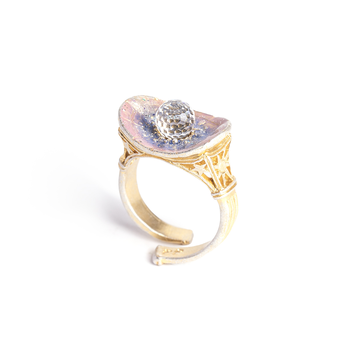 プラネタリウムや天体図、天の川などのモチーフをぎゅっと詰め込んだ神秘的なリング。