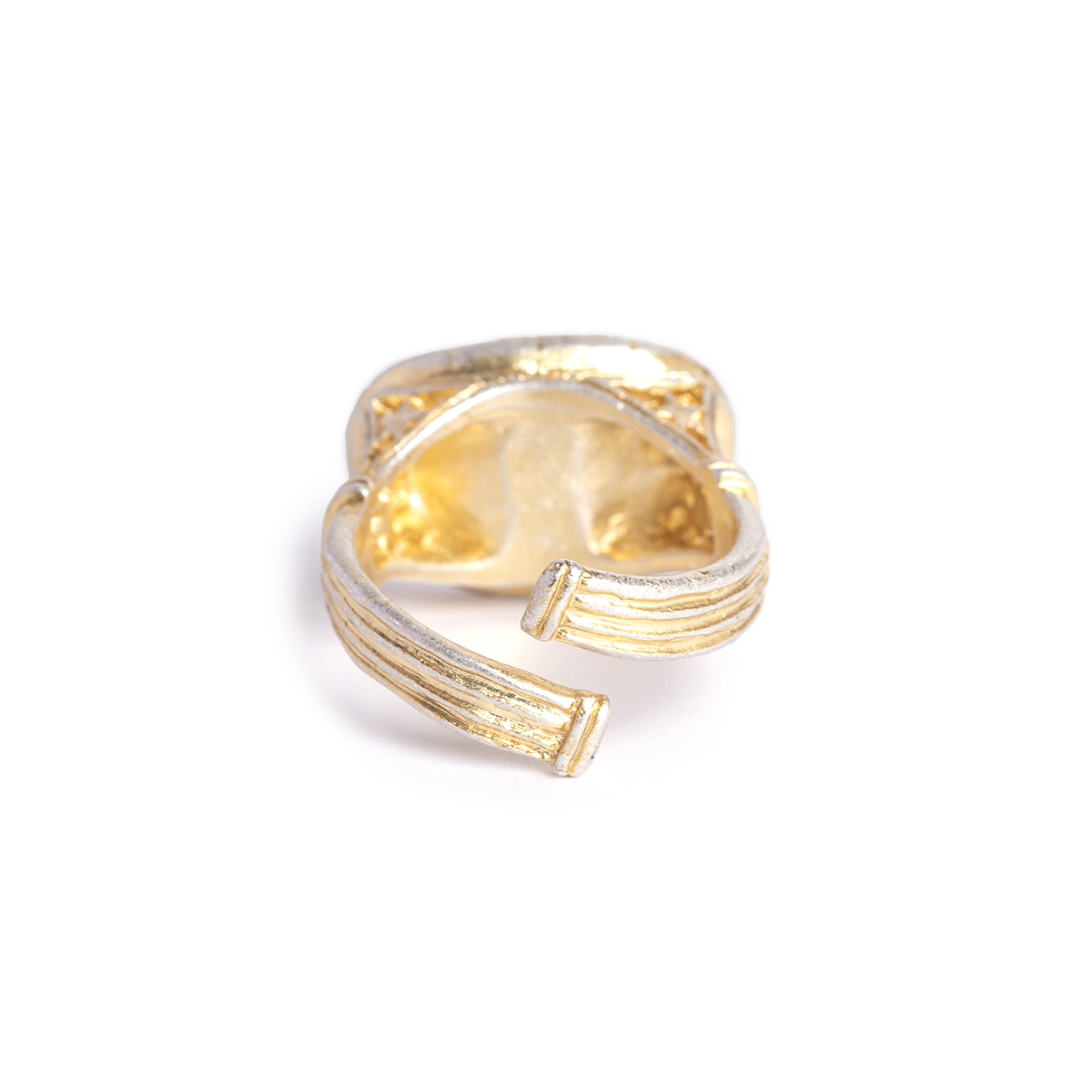 リングの腕部分は、古代ギリシャの建築文様をモチーフに造形され、細部までこだわりぬかれたデザインです。